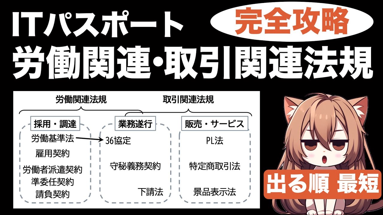 #ITパスポート #ITパスポート試験 #労働関連法規 #取引関連法規 #労働基準法 #36協定 #派遣 #準委任契約 #請負契約 #守秘義務契約 #NDA #PL法
