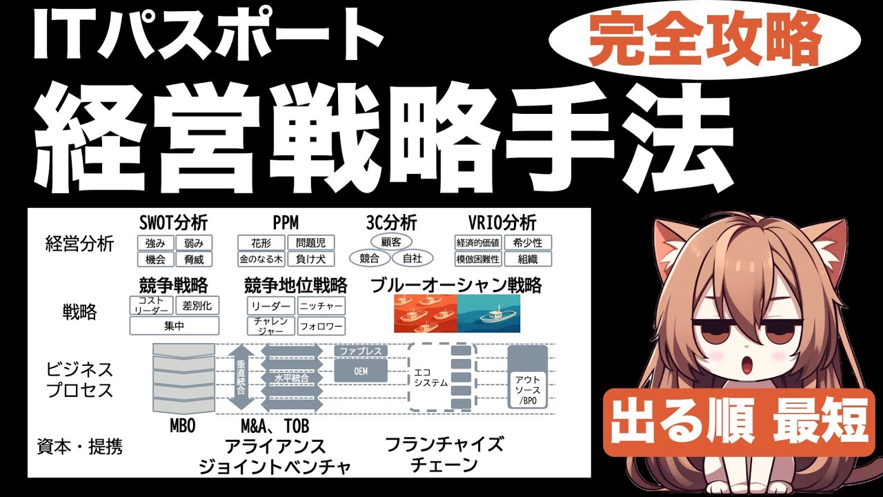 #ITパスポート #ITパスポート試験 #経営戦略 #SWOT #PPM #3C #VRIO #コストリーダー #差別化 #集中 #リーダー #チャレンジャー #フォロワー #ニッチャー #ブルーオーシャン #MBO #M&A #TOB #アライアンス