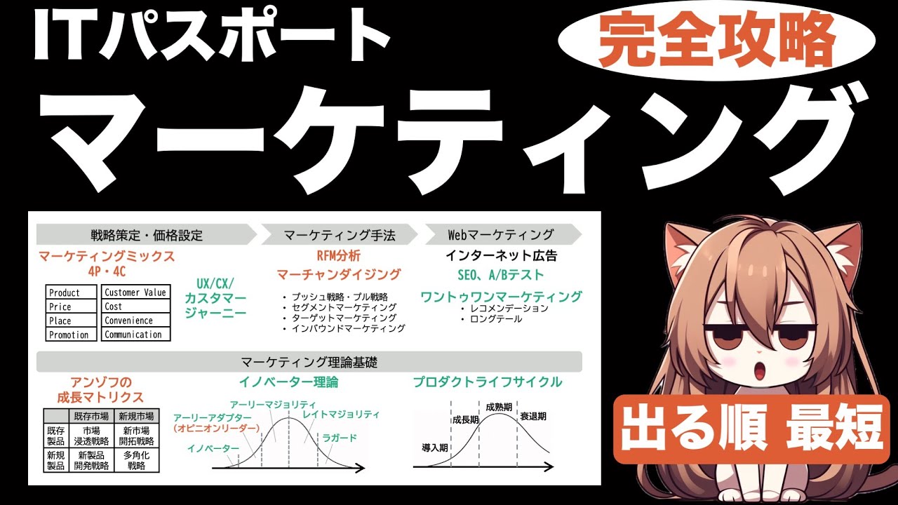 #ITパスポート #ITパスポート試験 #マーケティング #アンゾフ #イノベーター理論 #プロダクトライフサイクル #マーケティングミックス #4P #4C #カスタマージャーニー #RFM分析 #マーチャンダイジング #SEO #A/Bテスト #ワントゥワンマーケティング