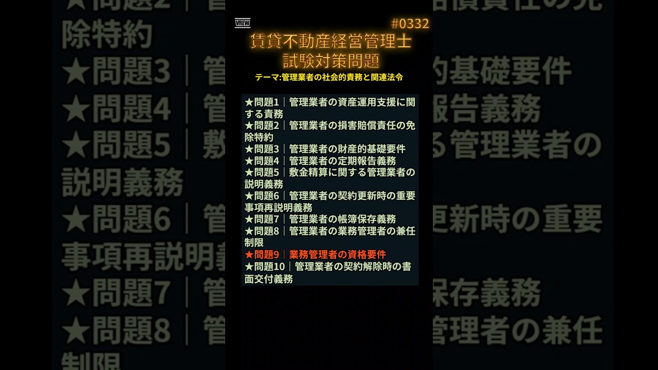 #0332 管理業者の社会的責務と関連法令★問題9|業務管理者の資格要件