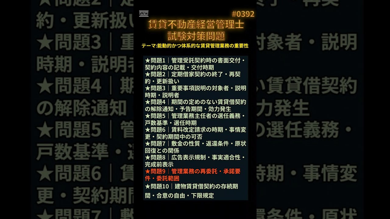 賃貸不動産経営管理士試験に挑むあなたへ──本試験で“差がつく”超難問を完全解説! この動画では、受験生を悩ませる「誤り問題」10問を厳選!予想正解率も提示しながら、誤り箇所を原文に太字で強調し、解説・法令名・条文番号・記憶のヒントまでフル装備で解説します。