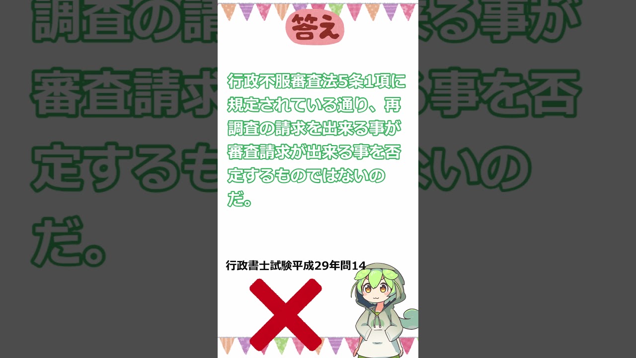 行政法一問一答 22『行政書士試験対策』 〇×問題 #行政書士#公務員試験#ずんだもん#shorts @リーガルずんだもん 行政書士 X LINE コピー 2025.10.05 行政法一問一答○×問題作成した動画を友だち、家族、世界中の人たちと共有 チャンネル登録、コメントをよろしくなのだ。 素材提供 VOICEVOX:ずんだもん 立ち絵(坂本アヒル)