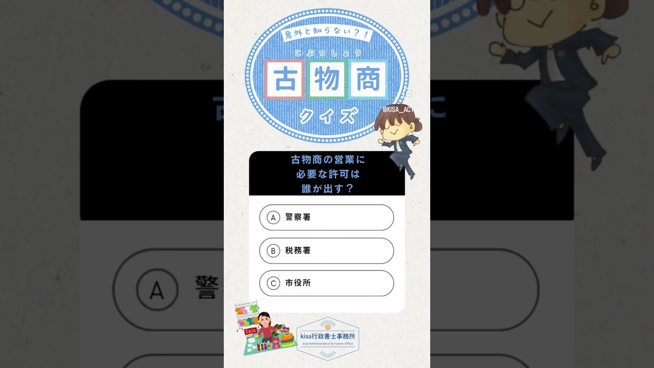 青森県つがる市のkisa行政書士事務所です🌼今回の「正解はコメント欄!」は古物商の問題。知ってて損はありません!#つがる市#青森県 #行政書士 #古物商 #メルカリ#ヤフオク #kisa行政書士事務所 行政書士 X LINE コピー 2025.10.08