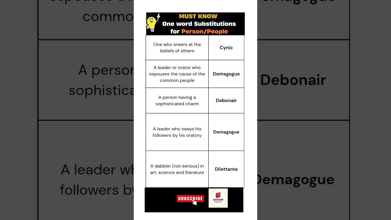 #AdvancedEnglish #PersonalityTypes #OneWordSubstitution #LearnEnglish #vocabulary #English Vocabulary #SpokenEnglish #BuildYourVocabulary #VocabularyBuilder #IELTSPrep #TOEFLPrep #shorts #substitution #englishspeaking #spokenenglish #speakenglish #speakenglishfluently