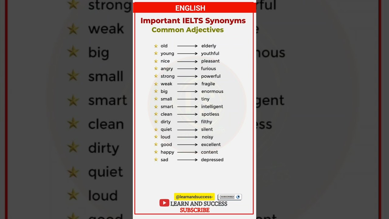 IELTS synonyms, IELTS vocabulary, common adjectives, powerful adjectives, upgrade English vocabulary, stop saying very, high-level vocabulary, advanced English, English for IELTS, IELTS speaking vocabulary, IELTS writing vocabulary, learn English, English grammar, vocabulary builder, language learning, Learn and Success, youthful, enormous, spotless, filthy, content, depressed, IELTS preparation, English Short