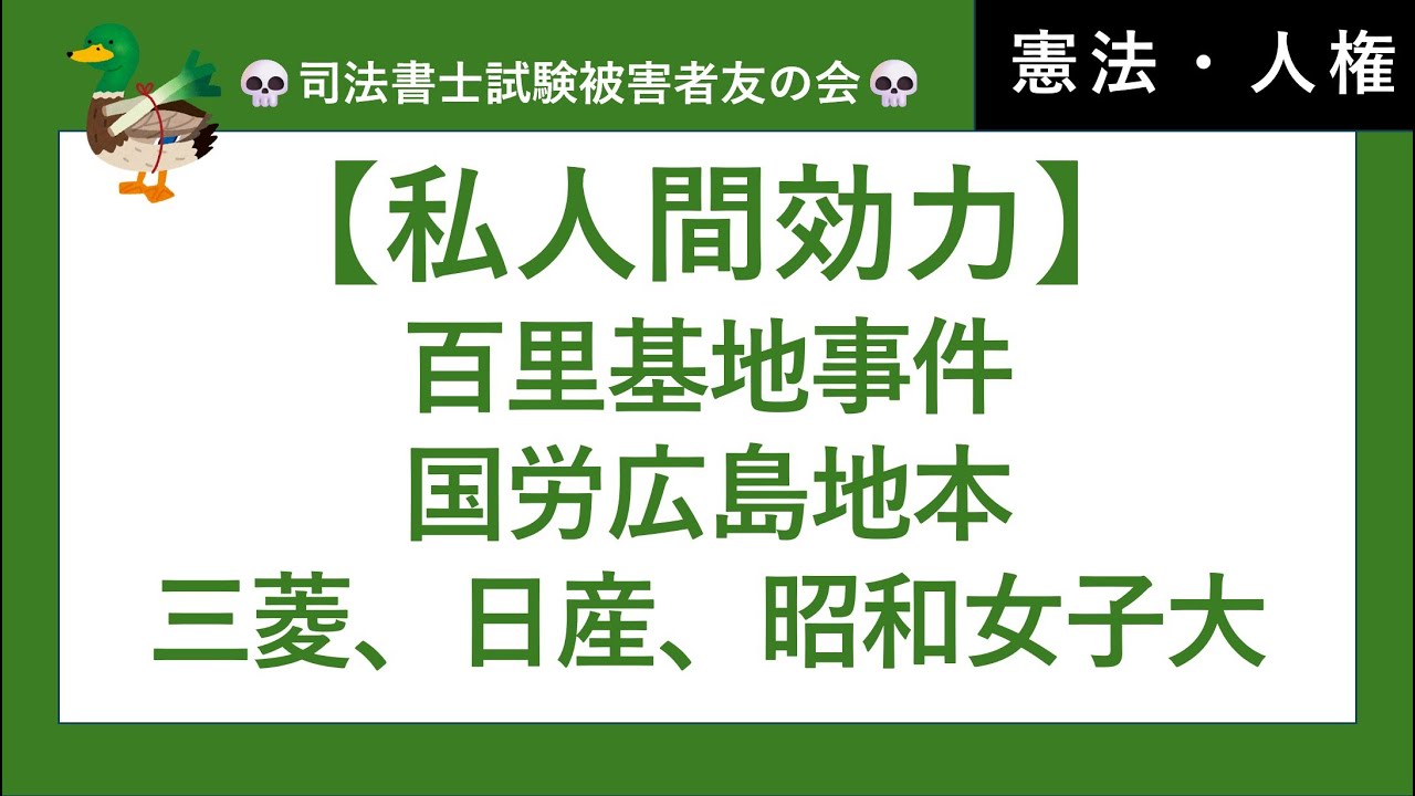 【司法書士・行政書士・公務員試験】私人間効力、百里基地事件、国労広島地本事件、三菱樹脂事件、日産自動車事件、昭和女子大事件、間接適用説