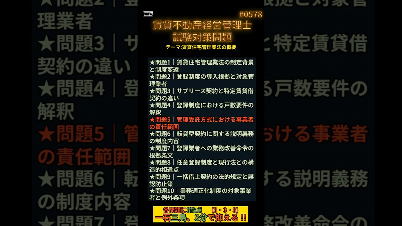 賃貸不動産経営管理士試験に挑むあなたへ──本試験で“差がつく”超難問を完全解説! この動画では、受験生を悩ませる「誤り問題」10問を厳選!予想正解率も提示しながら、誤り箇所を原文に太字で強調し、解説・法令名・条文番号・記憶のヒントまでフル装備で解説します。