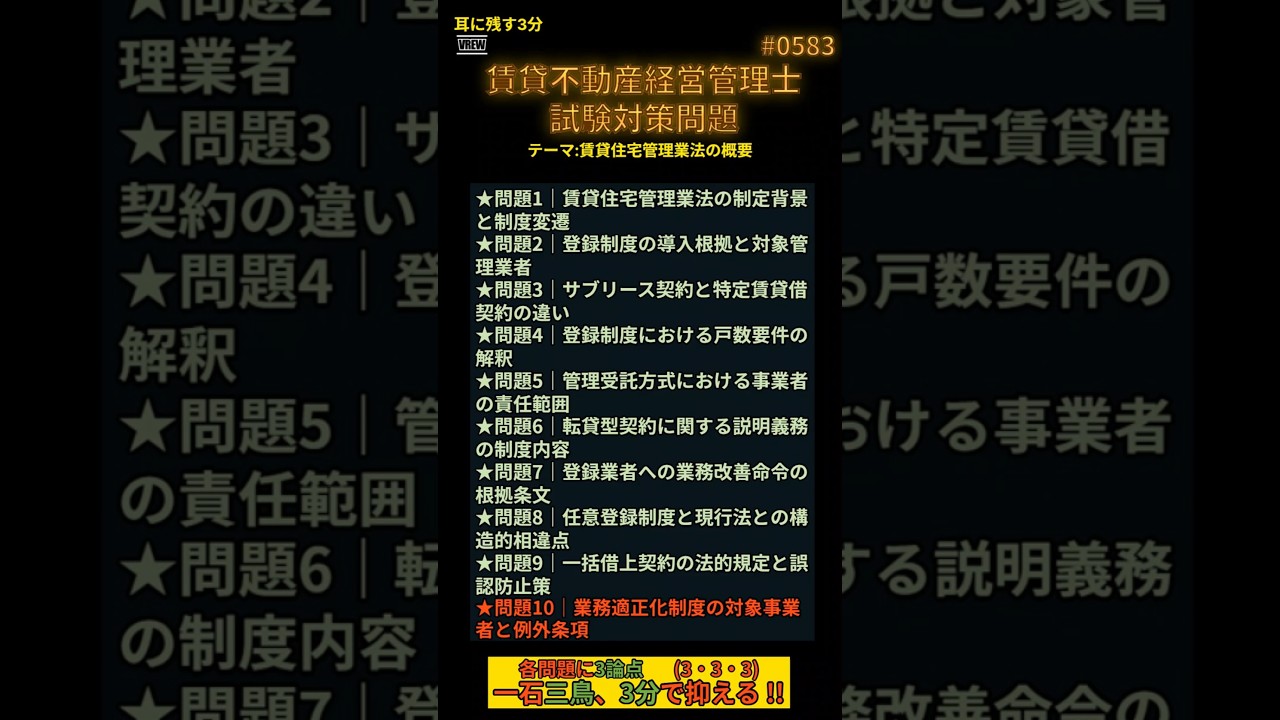 賃貸不動産経営管理士試験に挑むあなたへ──本試験で“差がつく”超難問を完全解説! この動画では、受験生を悩ませる「誤り問題」10問を厳選!予想正解率も提示しながら、誤り箇所を原文に太字で強調し、解説・法令名・条文番号・記憶のヒントまでフル装備で解説します。