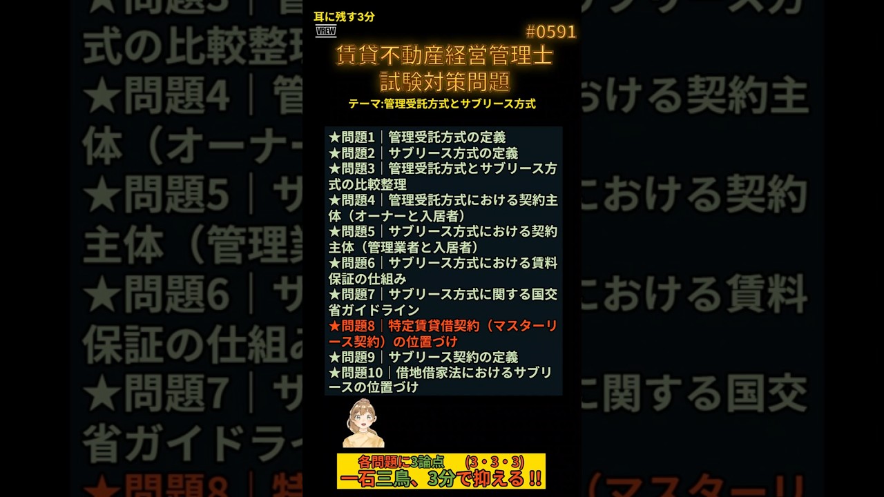 賃貸不動産経営管理士試験に挑むあなたへ──本試験で“差がつく”超難問を完全解説! この動画では、受験生を悩ませる「誤り問題」10問を厳選!予想正解率も提示しながら、誤り箇所を原文に太字で強調し、解説・法令名・条文番号・記憶のヒントまでフル装備で解説します。