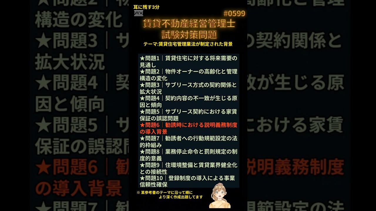 🎯 対象者 – 賃貸不動産経営管理士試験の受験者 – 試験対策の最終仕上げをしたい方 – 法令・条文に苦手意識がある方 – 記憶定着を効率化したい方 ※ チャンネル登録して頂いた方限定!(期間あり)! 万一、退去する際に、例えば『壁に穴開けちゃった』、『クロス汚してしまった』、『フローリングに傷付けた』等、これってどうなのを写真・動画を送付頂ければ、敷金診断士・住宅診断士・賃貸不動産メンテナンス主任者・管理業務主任者等としての中立的立場よりコメントさせて頂きます。また、不動産会社の対応の愚痴なんかもコメントください。 【自己紹介】 宅地建物取引士・管理業務主任者・競売不動産取引主任者・任意売却士・敷金診断士・防犯設備士・住宅診断士・賃貸住宅メンテナンス主任者等である玄空が紐解いていきます。