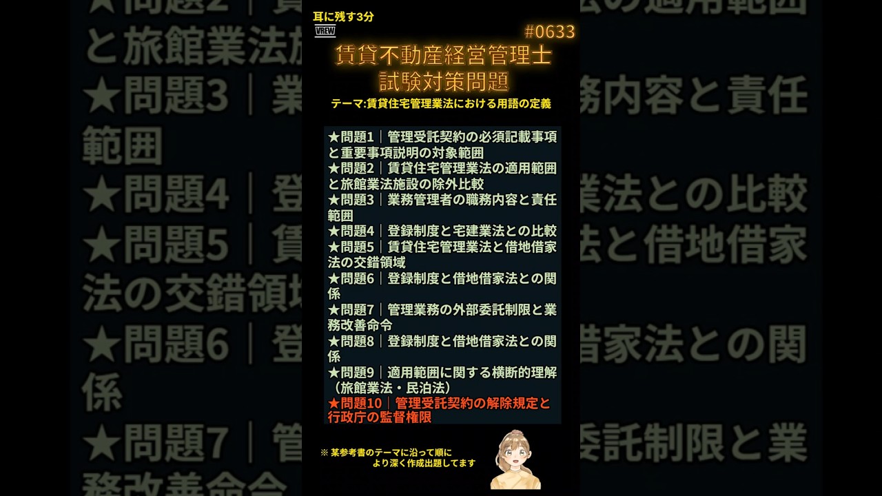 賃貸不動産経営管理士試験に挑むあなたへ──本試験で“差がつく”超難問を完全解説! この動画では、受験生を悩ませる「誤り問題」10問を厳選!予想正解率も提示しながら、誤り箇所を原文に太字で強調し、解説・法令名・条文番号・記憶のヒントまでフル装備で解説します。