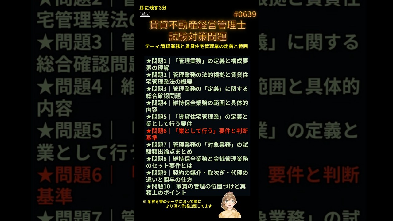 賃貸不動産経営管理士試験に挑むあなたへ──本試験で“差がつく”超難問を完全解説! この動画では、受験生を悩ませる「誤り問題」10問を厳選!予想正解率も提示しながら、誤り箇所を原文に太字で強調し、解説・法令名・条文番号・記憶のヒントまでフル装備で解説します。