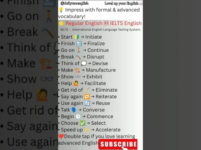 Boost your IELTS band score with advanced and formal vocabulary! In this video, you will learn high-level English words you can use in speaking and writing to sound more fluent and professional.