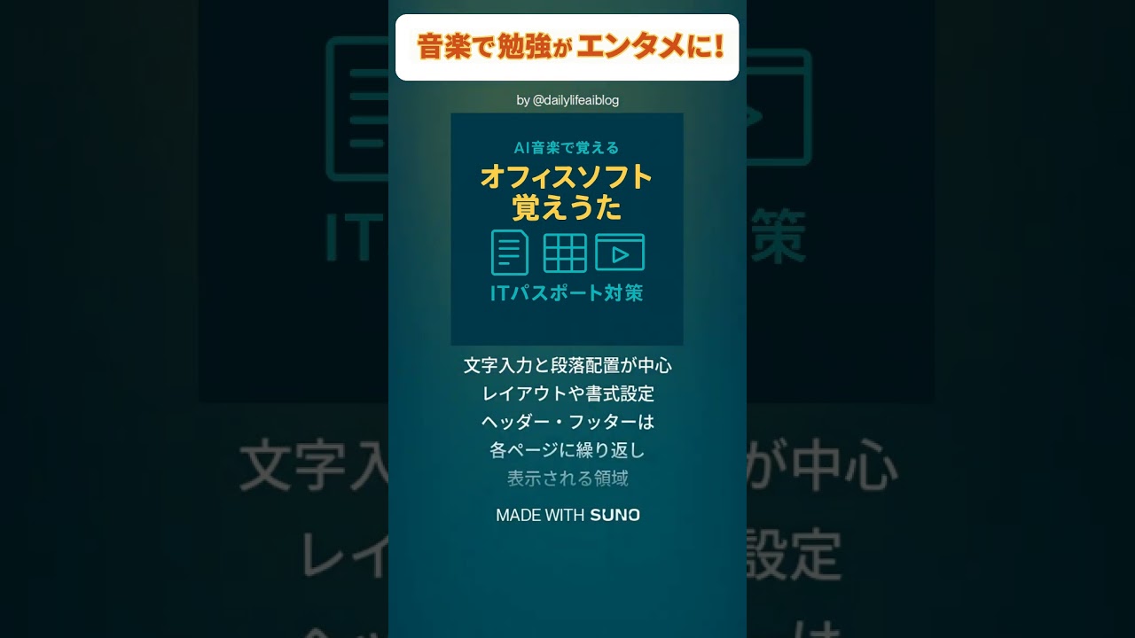 #ITパスポート #オフィスソフト #文書作成 #表計算 #プレゼンテーション #学習ソング #AI音楽 #SunoAI #覚えうた #ai作曲