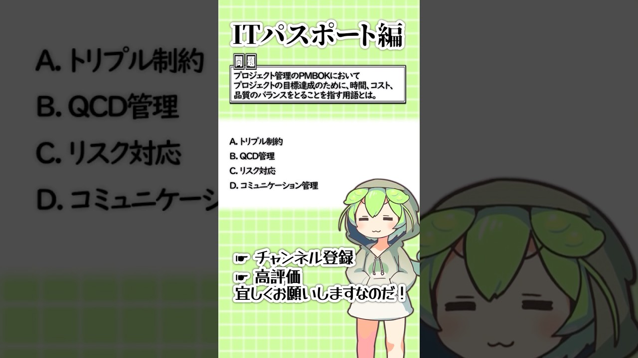 聞いて覚える!ITパスポートの4択問題を手軽に解くのだ!㊹ #ずんだもん #資格 #itパスポート ITパスポート(iパス) X LINE コピー 2025.11.252025.11.26 ご視聴頂きありがとうございます! コメント・高評価とても励みになります。 ◆Voicebox :ずんだもん #ずんだもん #資格 #IT