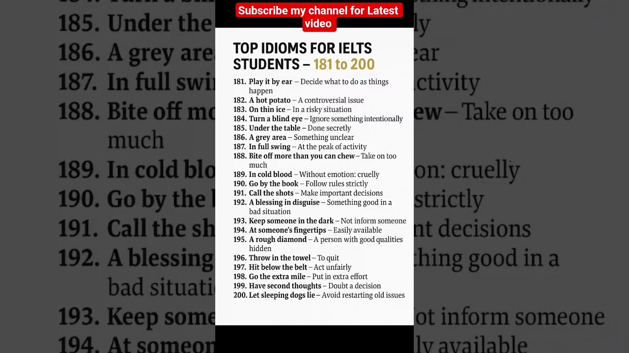 Is video me Top 20 High-Scoring Idioms (181–200) explain kiye gaye hain jo IELTS examiners ko impress karte hain.
