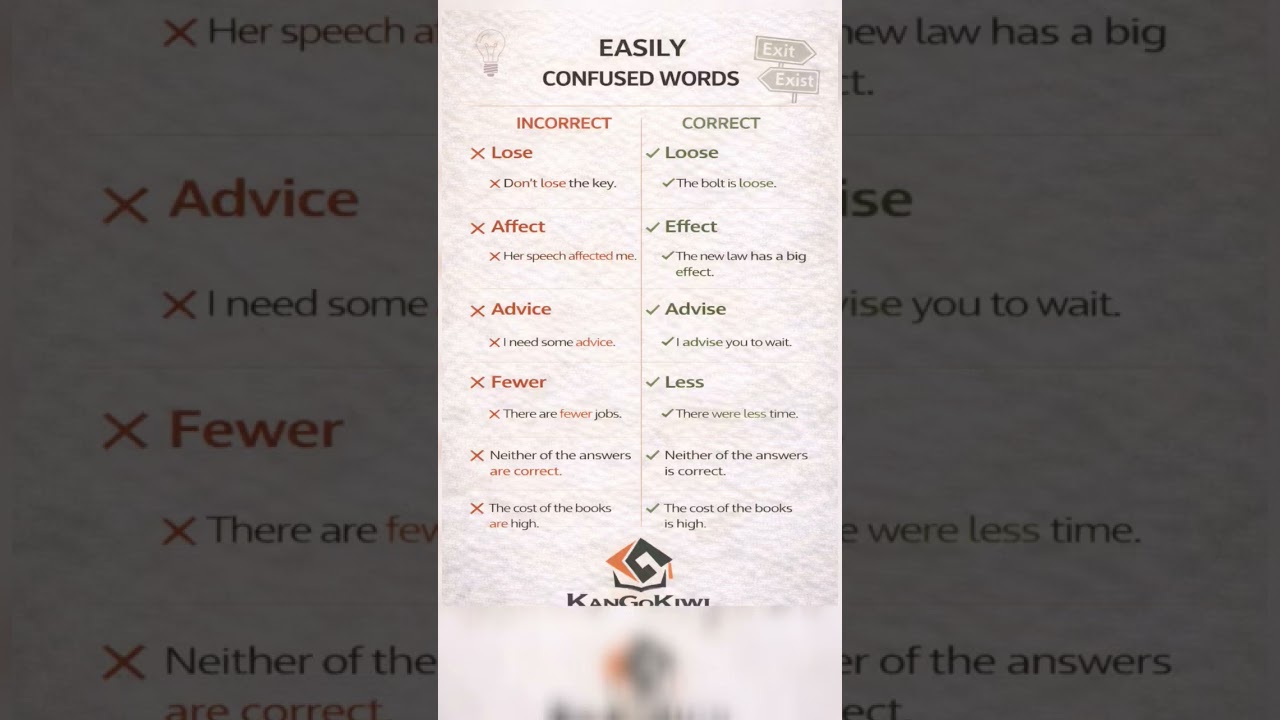 This short explains easily confused English words using clear wrong vs correct examples, so you can avoid errors like lose vs loose, affect vs effect, advice vs advise, and more.
