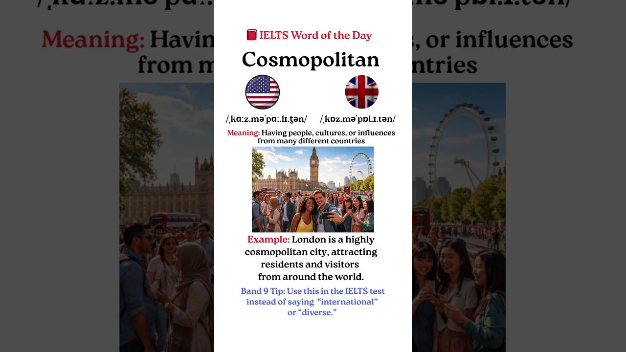 IELTS Word of the Day: Cosmopolitan. #ieltsvocabularyenglish #ieltsspeakingpractice #ieltsvocabulary