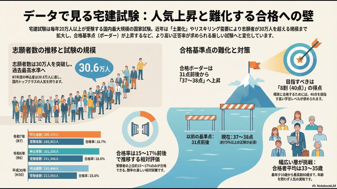 今回は、過去20年以上にわたる宅建試験(宅地建物取引士)の統計データを徹底分析します。毎年20万人以上が受験する国内屈指の人気資格ですが、近年の競争はどれほど激化しているのでしょうか?