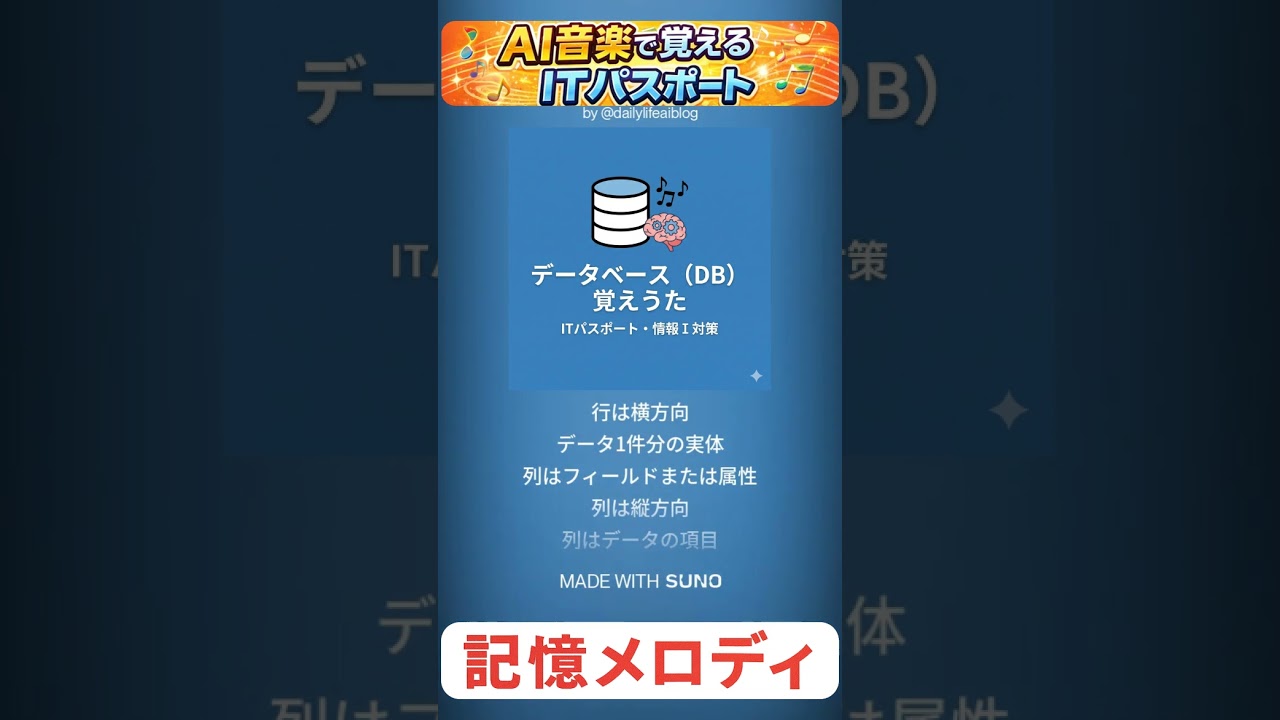 ITパスポート(iパス)ITパスポート試験や共通テスト情報Ⅰでつまずきやすい「データベース(DB)」の用語を、AI作曲のリズムに乗せて覚える暗記ソングです。
