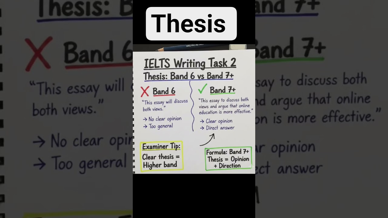 A Band 6 thesis is usually too general, while a Band 7+ thesis clearly shows your opinion and the direction of the essay.