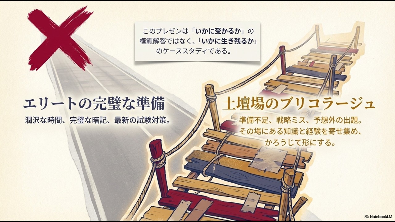 約30年前。1994年(平成6年)に実施された行政書士試験を題材に、極限の準備不足と予期せぬ事態が重なった「パーフェクトストーム」下において、手持ちの断片的な知識を即興で組み合わせて難局を打開する技法「ブリコラージュ」の有効性を検証した記録である。