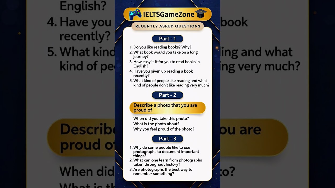Get ahead with these recently asked questions covering Parts 1, 2, and 3! This video focuses on popular topics like Reading Books and the Cue Card: “Describe a photo that you are proud of.