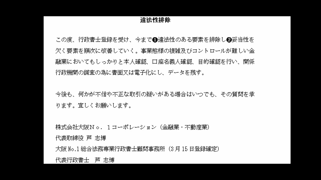 行政書士登録を受け、金融業と不動産業を営み。違法性を排除する宣言。在日中国人