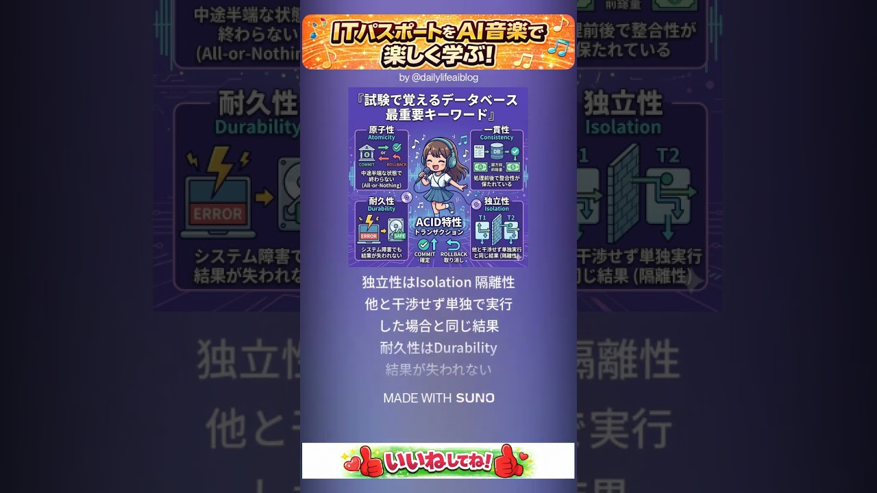 「データベース処理単位覚えうた」【ITパスポート暗記】トランザクションとACID特性の覚え方!聞き流し 歌って覚える #ITパスポート