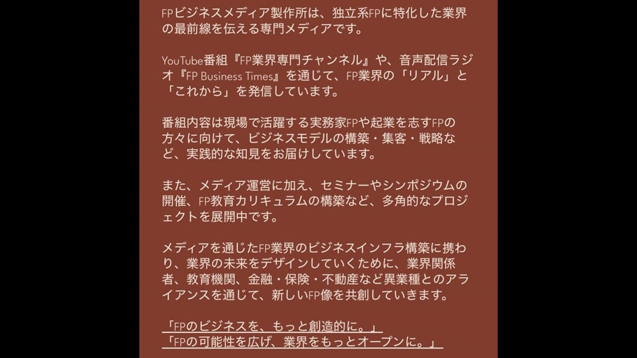 FPビジネスメディア制作所の町田貴規がFP業界に関する内容を発信する情報共有番組です。