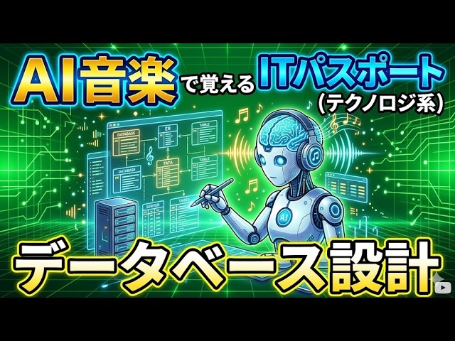 AI音楽で覚えるITパスポート【データベース設計】 (テクノロジ系) #itパスポート ITパスポート(iパス) X LINE コピー 2026.03.24 正規化や主キー、インデックスなど重要8曲でまとめて学習! データベース構造覚えうた 主キーと外部キーのうた 一意性と関連付け覚えうた 正規化のうた 第1~3正規化覚えうた E-R図覚えうた データクレンジング・結合覚えうた インデックス、コード設計覚えうた #ai作曲