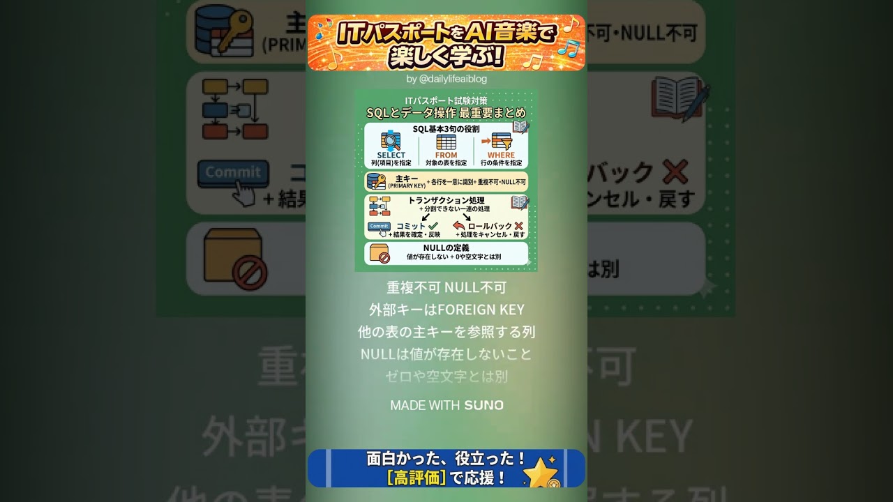 ITパスポート試験対策の決定版!覚えにくいデータベースのSQL用語を、エネルギッシュなSynth-popに乗せて楽しく暗記できる楽曲です。SELECTとWHEREの違いやトランザクション処理など、試験に出る最重要ポイントを端的にまとめました。隙間時間の学習や聞き流し暗記に最適です。