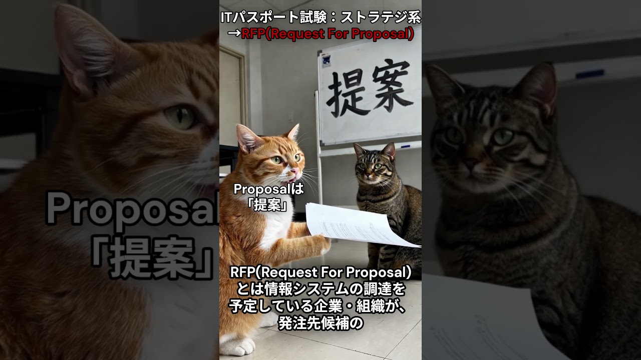 ITパスポート試験:ストラテジ系「RFP」#ITパスポート #ITパスポート試験 #資格勉強 #RFP #用語解説 #猫 #勉強垢 #リスキリング #cat #funny #comedy #cute