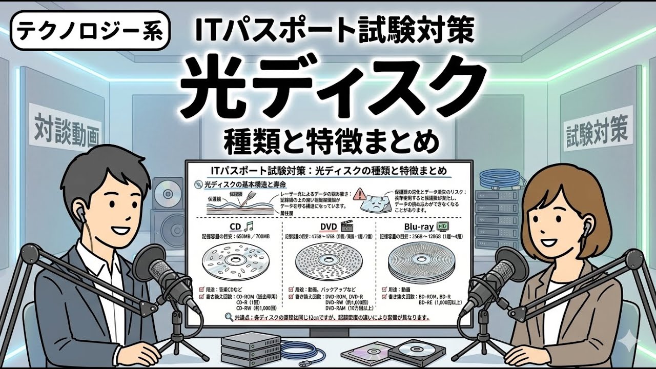 ãã®åç»ã§ã¯ãITãã¹ããŒã詊éšã§é »åºã®ãã¯ãããžç³»ãå ãã£ã¹ã¯ãã«ã€ããŠããã®çš®é¡ãç¹åŸŽããããŠããŒã¿ä¿åã®ä»çµã¿ããããããã解説ããŸããçããã®èº«ã®åãã«ããCDãDVDãBlu-ray Discãã©ã®ãããªæ§é ã§ãã©ã®ãããã®ããŒã¿ãä¿åã§ããã®ãããããŠé·æä¿åã®æ³šæç¹ãªã©ãäœç³»çã«åŠã¹ãŸããåãªãæèšã§ã¯ãªããä»çµã¿ããçè§£ããããšã§ç¥èãå®çããã詊éšã§ç¢ºå®ã«åŸç¹ã§ããåãé€ããŸãããïŒ