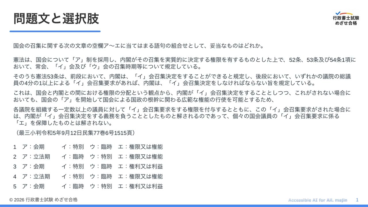 令和7年度 行政書士試験 問題5(憲法:国会の召集・空欄補充)