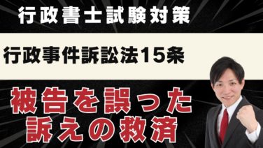 行政書士試験対策として行政事件訴訟法15条 被告を誤った訴えの救済をわかりやすく解説します。行政事件訴訟では本来訴えるべき被告を誤ってしまうケースがあります。そのような場合でも、一定の要件を満たせば裁判所は被告の変更を認めることができます。...