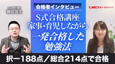 2025年合格目標 S式合格講座(鎌田クラス) 合格者インタビュー法律初学者から一発合格。家事・育児をしながら、択一188点/総合214点という高得点を獲得した合格者インタビューです。朝は講義を聴きながらお弁当準備昼はスキマ時間で問題演習夜...
